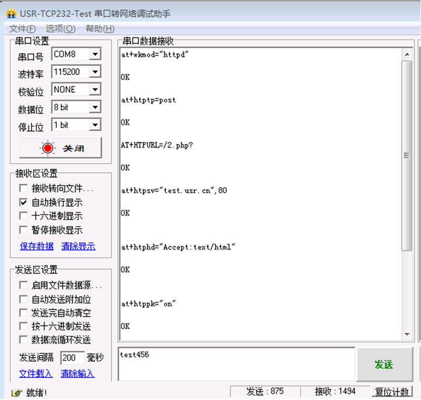 Test.usr.cn這個(gè)服務(wù)器的功能就是,串口發(fā)送什么數(shù)據(jù),服務(wù)器就將收到的數(shù)據(jù)返回到串口端。
