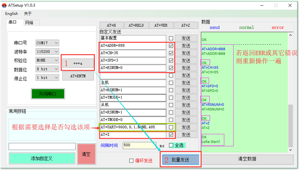③若參數(shù)配置過程中右側(cè)數(shù)據(jù)框返回錯誤,則從新點“+++ a”進(jìn)入配置狀態(tài),再點擊“批量發(fā)送”進(jìn)行配置;