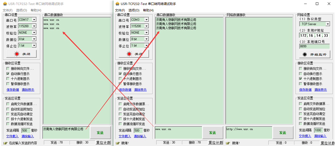 打開兩個串口助手,將兩個設(shè)備用串口線接到電腦,一個串口助手發(fā)送數(shù)據(jù),另一個串口助手能夠正常接收數(shù)據(jù)。