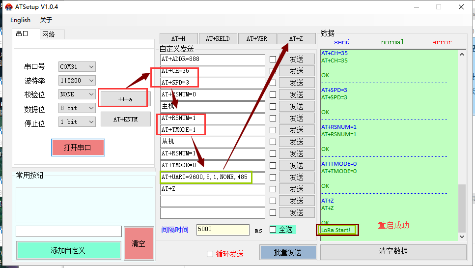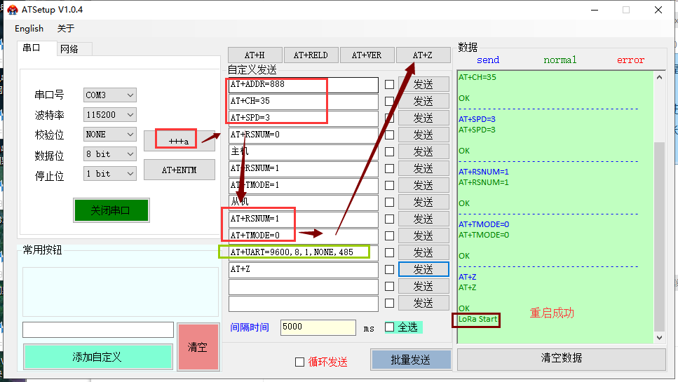 2、打開串口后先點擊“+++ a”,再按照順序發(fā)送指令,等待參數(shù)設(shè)置完成即可(右側(cè)數(shù)據(jù)框返回“LoRa Start!”表示設(shè)備設(shè)置完成,重啟ok;若改了口數(shù)只返回OK,不會打印“LoRa Start!”)