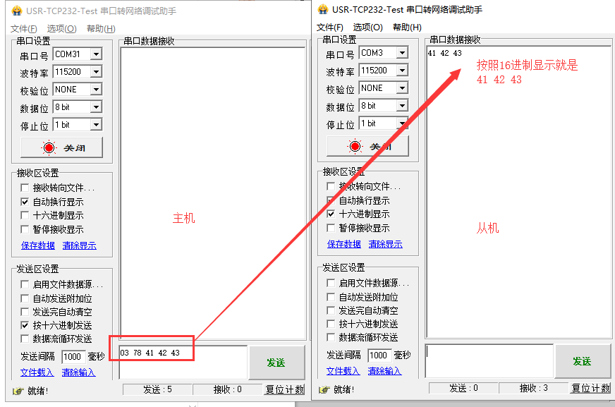 2)主機給從機發(fā)數(shù)據(jù),格式:從機NID(hex) + DATA ,例:向從機(目標地址888(Dec))發(fā)送41 42 43(hex),則向串口輸入:03 78 41 42 43