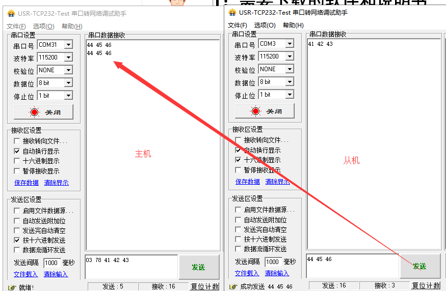 1)打開兩個串口助手,將兩個設(shè)備用串口線接到電腦,一個串口助手發(fā)送數(shù)據(jù),另一個串口助手能夠正常接收數(shù)據(jù)。