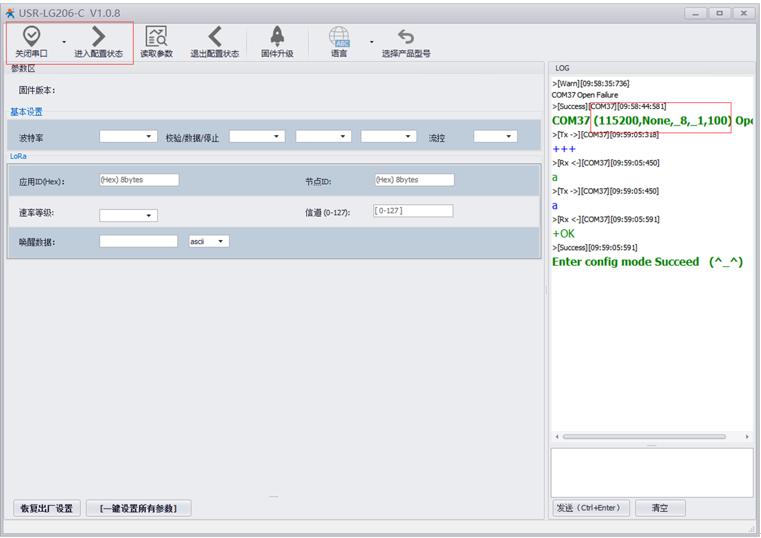(1)進(jìn)入配置狀態(tài),讀取lora參數(shù)。設(shè)置軟件下載地址:http://www.lifj.com.cn/Download/693.html
