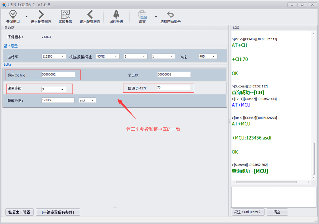 設(shè)置lora終端的信道速率及應(yīng)用id和集中器的信道一參數(shù)相同。