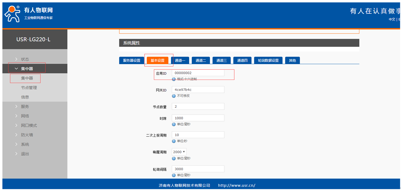(3) 設(shè)置集中器的應(yīng)用ID,依次點(diǎn)擊集中器,基本設(shè)置,應(yīng)用ID,設(shè)置應(yīng)用ID和lora相同。最后保存應(yīng)用。