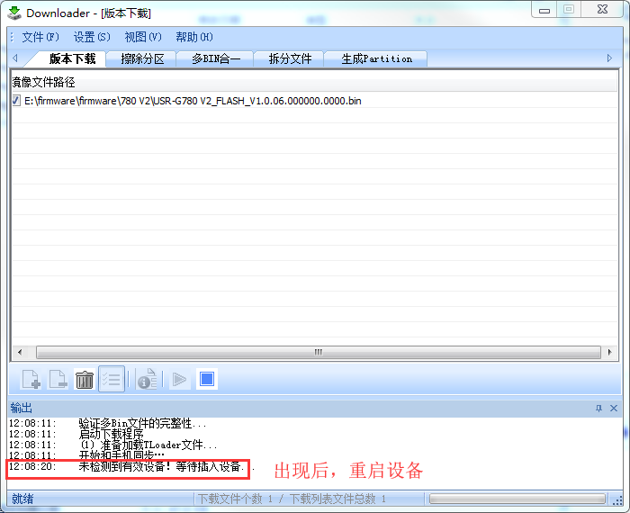 6. 出現(xiàn)“未檢測到有效設備!等待插入設備”時,斷電重啟模塊;等待固件下載完成即可