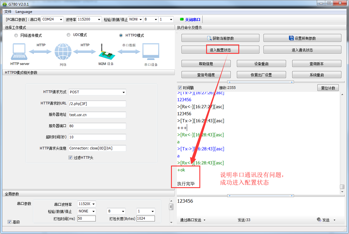 4. 點擊進入配置狀態(tài),沒有收到+OK,只有3個+++
