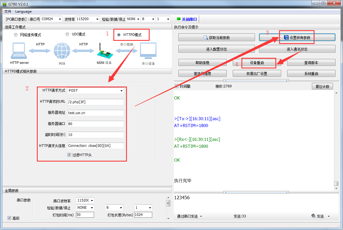 (1) 硬件連接:裝上sim卡,接上天線,780 V2的串口通過UAB轉(zhuǎn)RS232/485接到PC上,用我司提供的適配器供電。