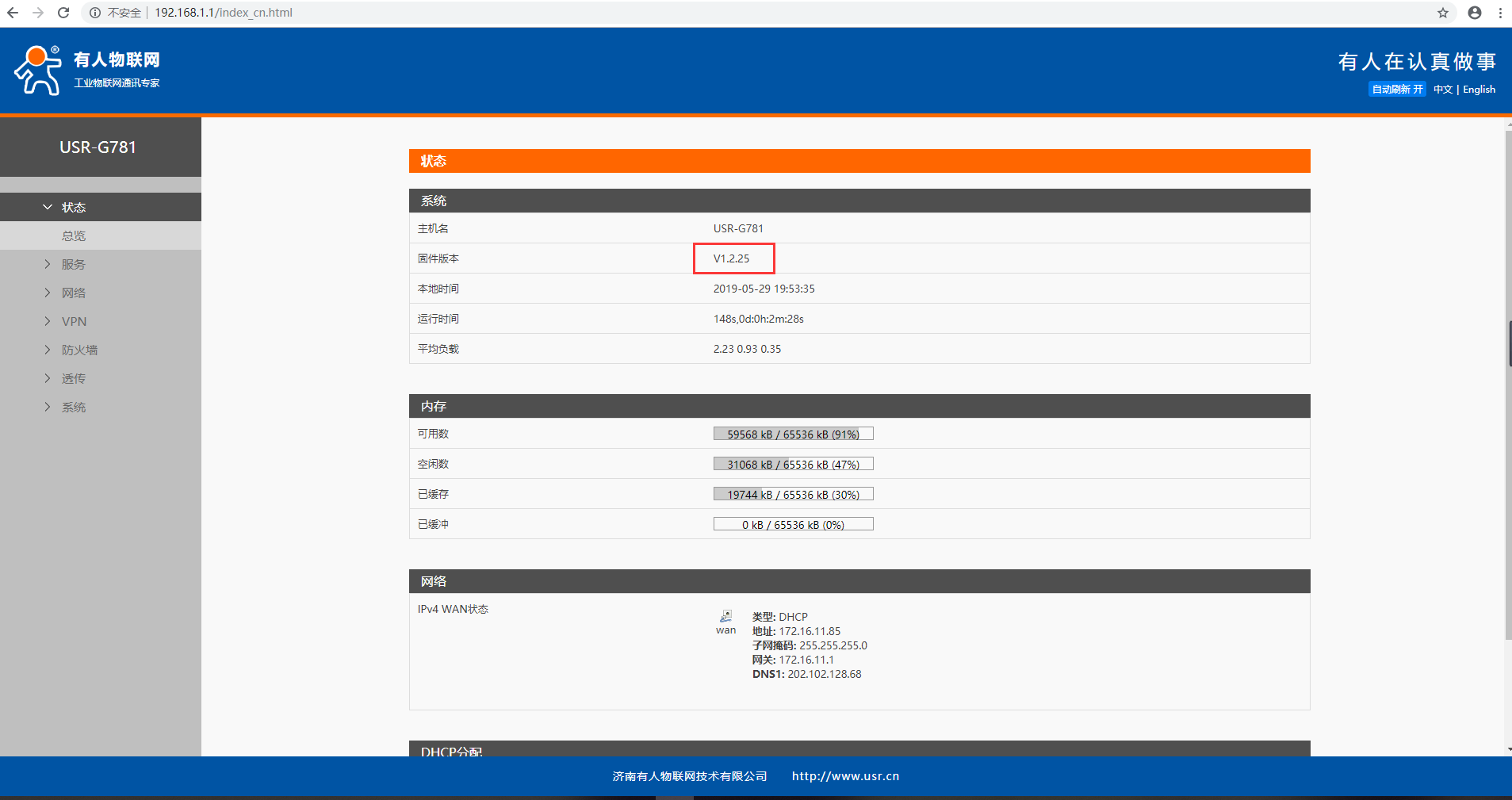 5、 等待設(shè)備升級固件完畢自動重啟完成后,重新進(jìn)入配置網(wǎng)頁,可在狀態(tài)總覽頁面查看到固件版本已經(jīng)更改