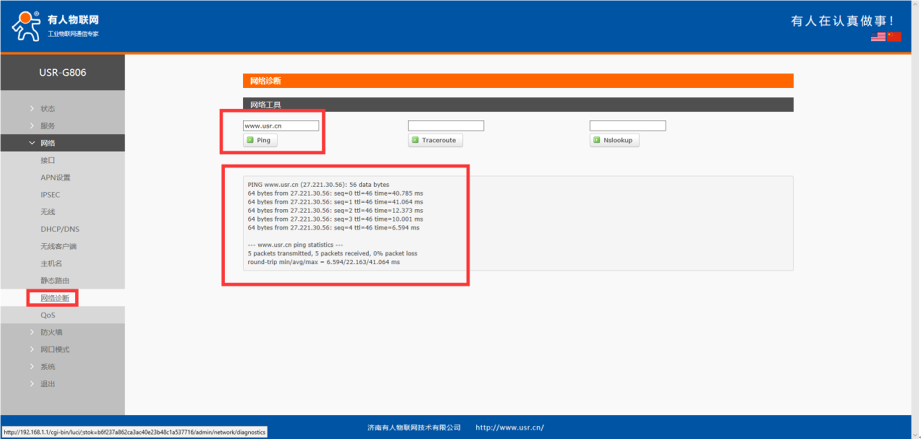 3、 打開(kāi)瀏覽器,地址欄輸入192.168.1.1,進(jìn)入G806的設(shè)置網(wǎng)頁(yè),用戶(hù)名密碼都是root(注意:不要使用360瀏覽器),點(diǎn)擊網(wǎng)絡(luò)---接口界面,可以看到當(dāng)前有三個(gè)接口,LAN、WAN-4G、WAN-WIRED,分別是局域網(wǎng)接口,4G接口,有線(xiàn)網(wǎng)接口。(注意:LAN接口網(wǎng)段和其他的WAN接口IP網(wǎng)段不能沖突。)