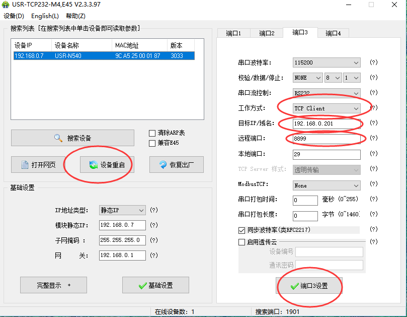 打開端口3將設(shè)備得工作模式選擇“TCP client”,目標(biāo)IP設(shè)置為“192.168.0.201”,然后端口號(hào)設(shè)置為“8899”,點(diǎn)擊“端口三”設(shè)置,然后設(shè)備重啟。