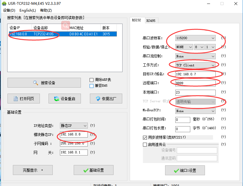 2. 設(shè)置410S (第二臺(tái))的參數(shù):打開(kāi)設(shè)置軟件USR-TCP232-M4-setup-V2.3.3.97,設(shè)置他的工作方式為TCP clinet,設(shè)置他的“目標(biāo)IP/域名”為:192.168.0.7,設(shè)置遠(yuǎn)程端口號(hào)為8899,然后點(diǎn)擊“端口1設(shè)置”,點(diǎn)擊“基礎(chǔ)設(shè)置”再點(diǎn)擊“設(shè)備重啟”。如圖所示: