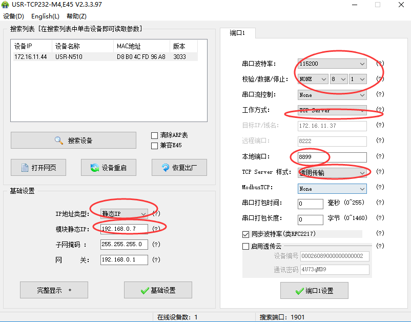 1. 設(shè)置N510(第一臺(tái))的參數(shù):打開設(shè)置軟件USR-TCP232-M4-setup-V2.3.3.97,設(shè)置他的工作方式為TCP sever,設(shè)置本地端口號(hào)為8899. 然后點(diǎn)擊“端口1設(shè)置”,再點(diǎn)擊“設(shè)備重啟”。如圖所示:
