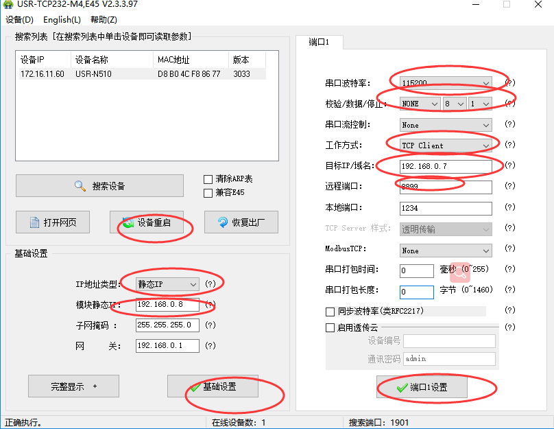 2. 設(shè)置N510 (第二臺(tái))的參數(shù):打開設(shè)置軟件USR-TCP232-M4-setup-V2.3.3.97,設(shè)置他的靜態(tài)IP為“192.168.0.8”設(shè)置他的工作方式為TCP clinet,設(shè)置他的“目標(biāo)IP/域名”為:192.168.0.7,設(shè)置遠(yuǎn)程端口號(hào)為8899,然后點(diǎn)擊“端口1設(shè)置”,點(diǎn)擊“基礎(chǔ)設(shè)置”再點(diǎn)擊“設(shè)備重啟”。如圖所示: