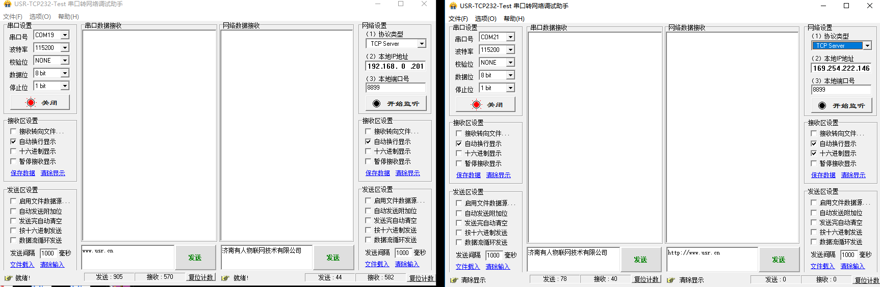 3. 將兩太設(shè)備通過(guò)網(wǎng)線鏈接,分別用USB轉(zhuǎn)232串口線將他們鏈接到電腦上,打開兩個(gè)測(cè)試軟件(USR-TCP232-Test-V1.3),分別打開兩者對(duì)應(yīng)的串口: