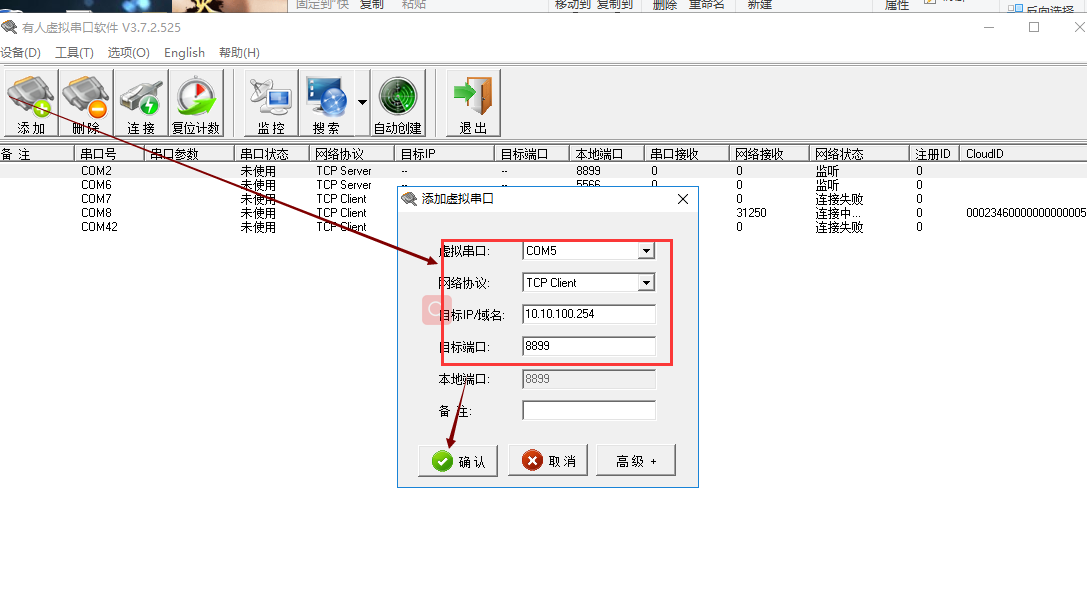 1>添加虛擬串口,網(wǎng)絡(luò)協(xié)議TCP client,服務(wù)器IP地址10.10.100.254,服務(wù)器端口號(hào)8899,確認(rèn)