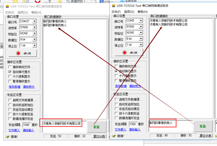 從下圖可以看出,串口和網(wǎng)絡(luò)端可以正常的雙向數(shù)據(jù)收發(fā)