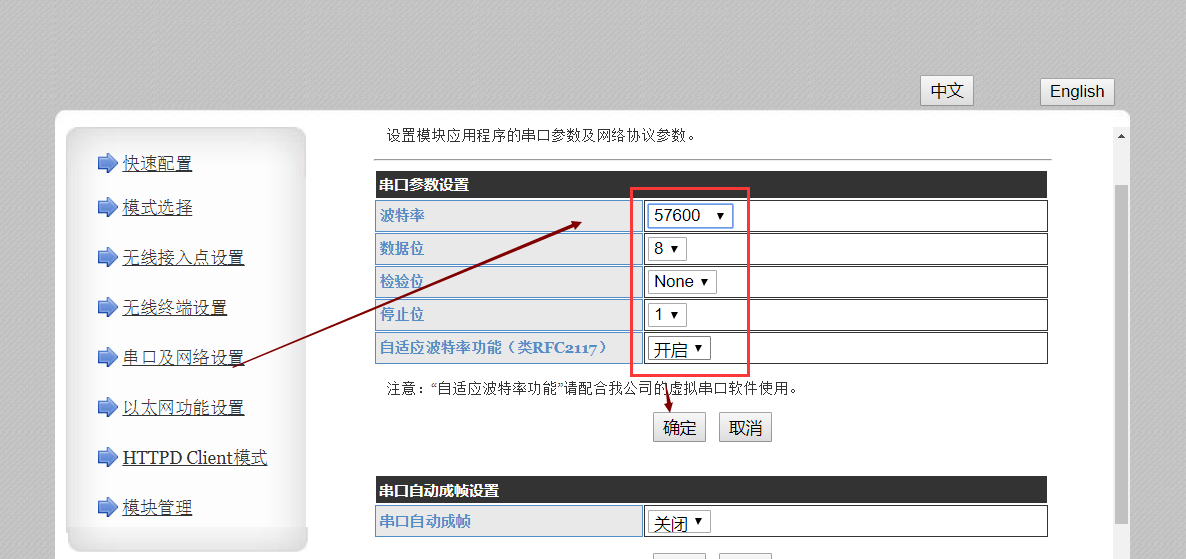 在這個(gè)選項(xiàng)中,可以設(shè)置w630的串口參數(shù)以及網(wǎng)絡(luò)參數(shù),客戶可以根據(jù)實(shí)際情況確認(rèn)是否需要修改波特率以及w630的網(wǎng)絡(luò)工作模式,在本案例中不做修改,采用默認(rèn)狀態(tài)。