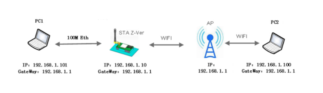 USR-W610模塊(以下簡(jiǎn)稱(chēng)W610)通過(guò)Wi-Fi接到AP上,PC1通過(guò)以太網(wǎng)接到W610模塊上,這時(shí)W610模塊相當(dāng)于一個(gè)透明的設(shè)備,PC1和PC2在同一個(gè)局域網(wǎng),相互通訊不受任何限制,如果AP可以聯(lián)網(wǎng),那么PC1也是可以上網(wǎng)的。下面介紹如何設(shè)置A2模塊,才能實(shí)現(xiàn)這種功能。