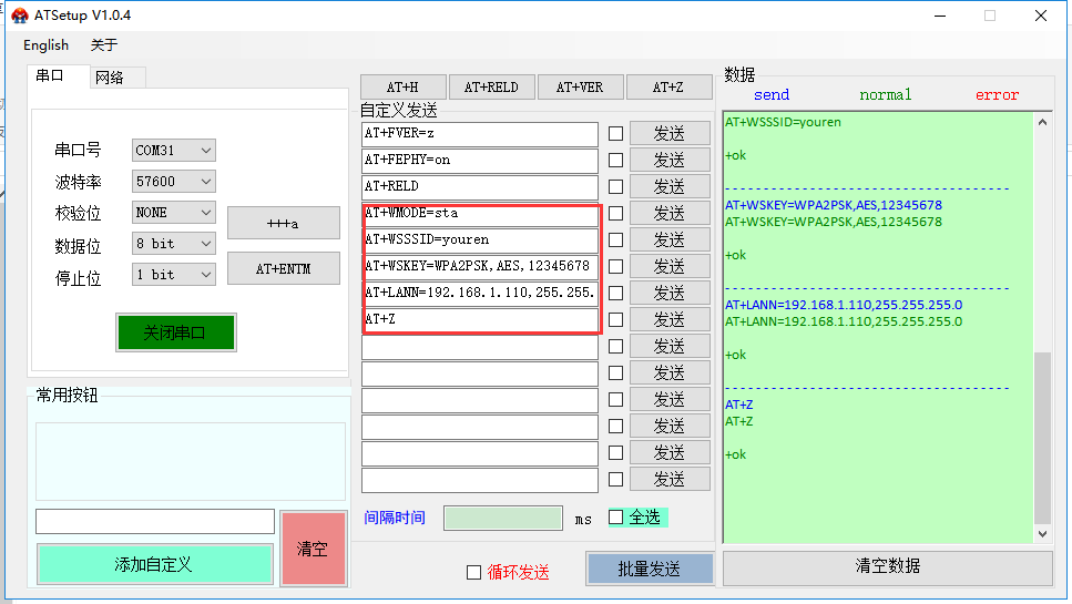 AT+WSKEY=WPA2PSK,AES,12345678 設(shè)置路由器的WiFi的加密方式和密碼