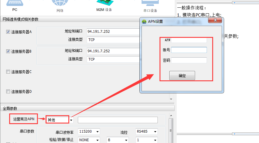 全局參數(shù)-->運(yùn)營(yíng)商及APN-->其他,在彈出的框里面設(shè)置APN信息,用戶名和密碼(有的話就設(shè)置,沒有的話,就空著)