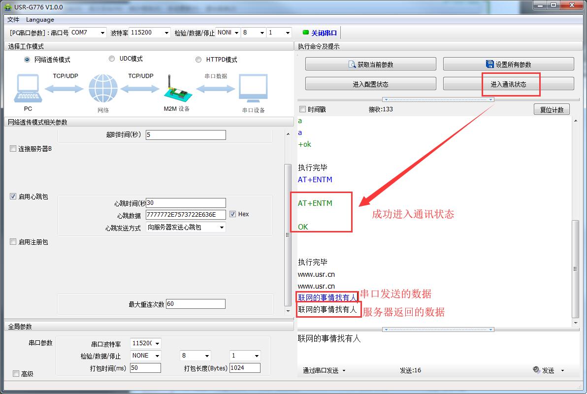 A:1>進(jìn)入配置狀態(tài)后:模塊只能識(shí)別AT指令(注意AT指令最后一定要加回車換行),不能進(jìn)行數(shù)據(jù)收發(fā)的;如果發(fā)送數(shù)據(jù)的話,模塊就會(huì)報(bào)錯(cuò)或者數(shù)據(jù)無法發(fā)送成功,這時(shí)候需要先進(jìn)入通訊狀態(tài)(成功現(xiàn)象見上面第5步的圖片),然后在發(fā)送數(shù)據(jù)(總有客戶在配置狀態(tài)下,發(fā)送數(shù)據(jù)導(dǎo)致發(fā)送數(shù)據(jù)失敗或者模塊報(bào)錯(cuò))