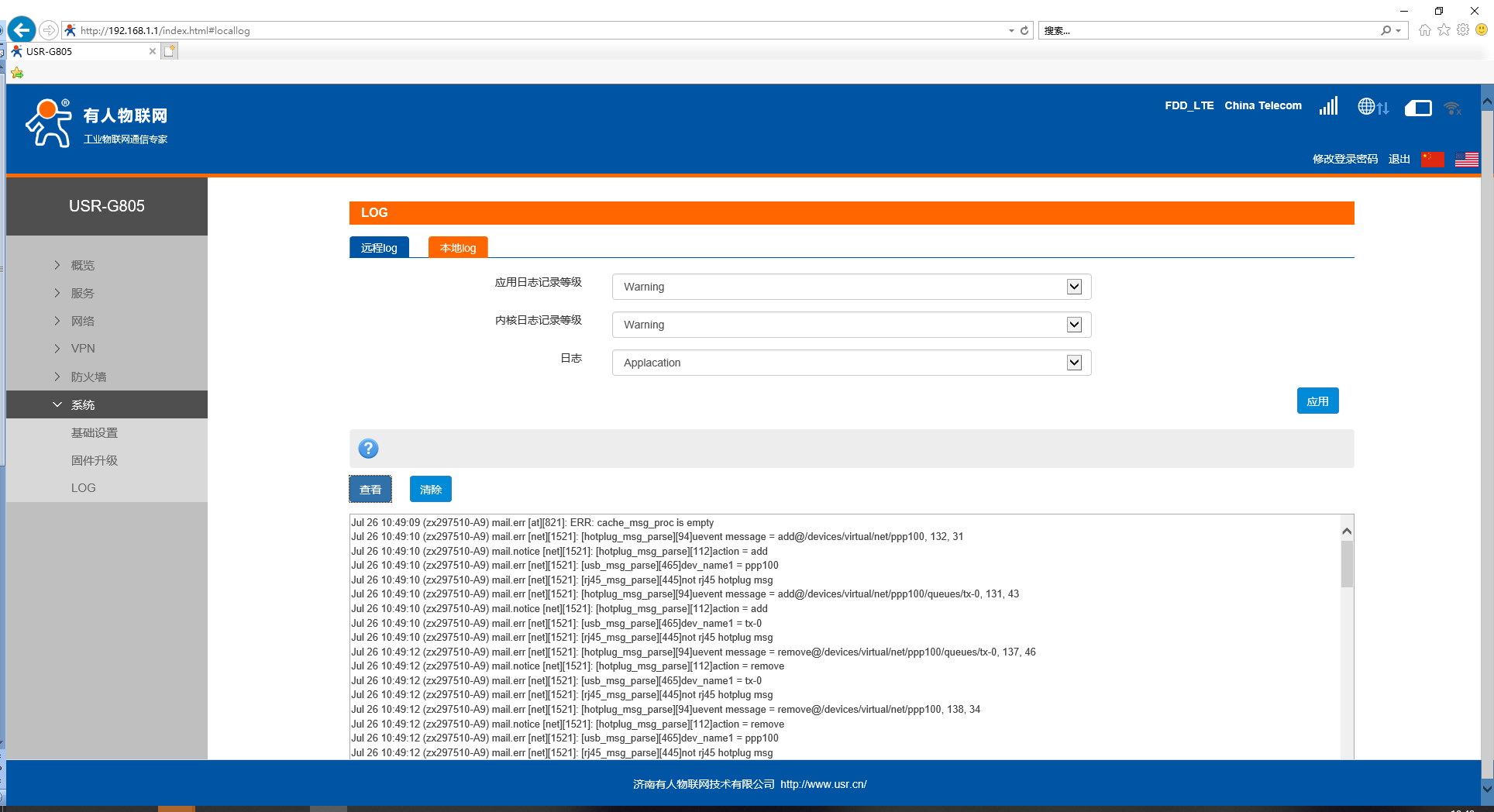 日志(Kernel、Application、VPN)支持即時(shí)查看、清空;如下圖: