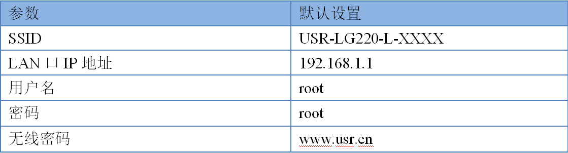 默認(rèn)情況下,USR-LG220-L的無線AP的默認(rèn)名稱為USR-LG220-L -xxxx,IP地址和用戶名、密碼如下:
