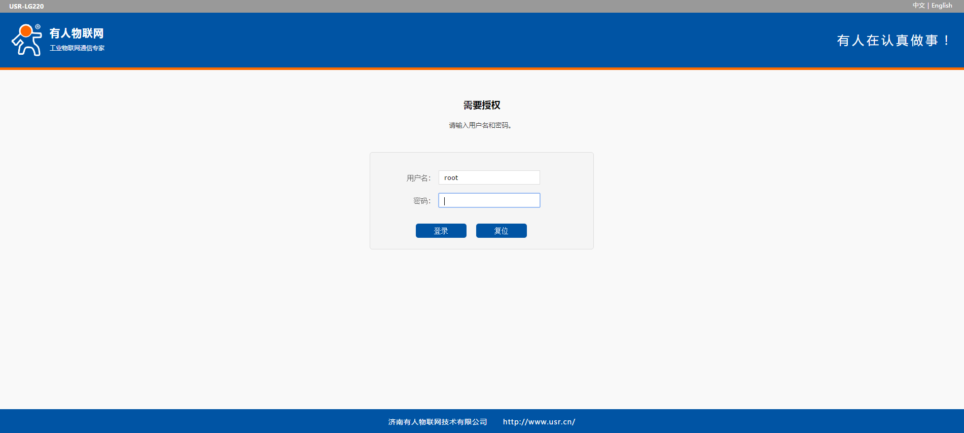 等無線連接好后,打開瀏覽器,在地址欄輸入192.168.1.1回車。填入用戶名和密碼(均為root),然后點(diǎn)擊確認(rèn)登錄,網(wǎng)頁會出現(xiàn)USR-LG220-L的管理頁面,如下圖。