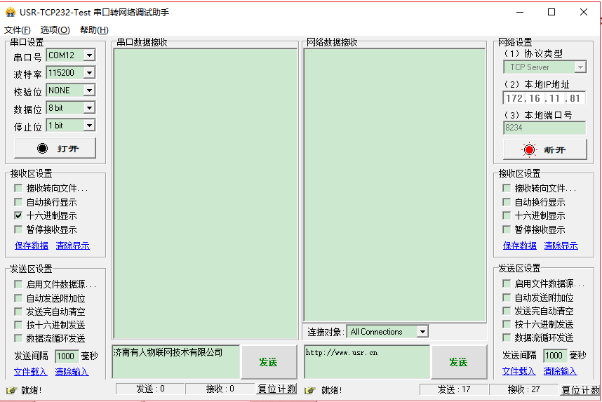 打開USR-TCP232-Test串口轉(zhuǎn)網(wǎng)絡(luò)調(diào)試助,下載地址http://www.lifj.com.cn/Download/27.html