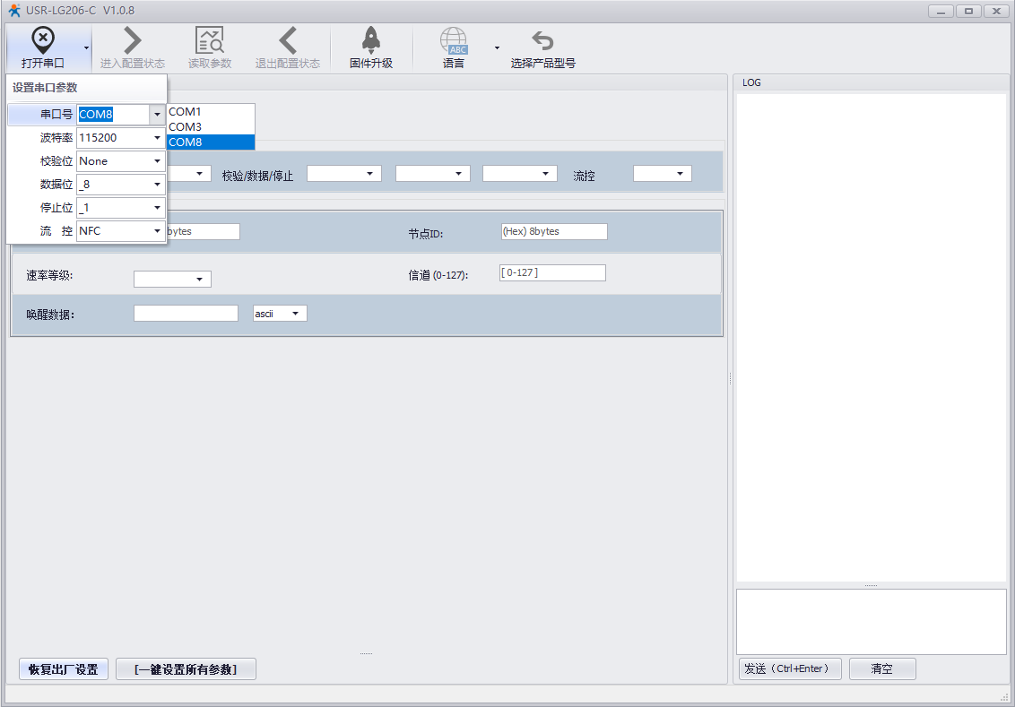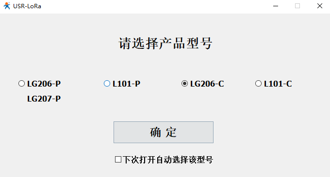 這里以有人LoRa終端USR-LG206-L-C為例。使用串口線連接LoRa終端的RS232接口與電腦,打開USR_LoRa軟件(http://www.lifj.com.cn/Down/USR_LoRa_SET-V1.0.8.rar),選擇LG206-C。