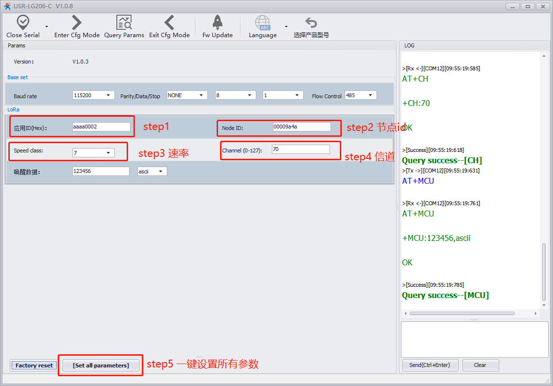 設(shè)置應(yīng)用ID、信道、速率。在下圖所示區(qū)域設(shè)置應(yīng)用ID為aaaa0002、速率等級設(shè)為7、信道設(shè)為70,然后點擊“一鍵設(shè)置所有參數(shù)”。應(yīng)用ID要與集中器設(shè)置的應(yīng)用ID一致,信道要與集中器通道1設(shè)置的信道一致,速率要與集中器通道1設(shè)置的速率一致,在同一個集中器的LoRA網(wǎng)絡(luò)內(nèi)節(jié)點的應(yīng)用ID要保證唯一。節(jié)點ID為206標簽上表示的ID. 設(shè)置完成關(guān)閉串口。