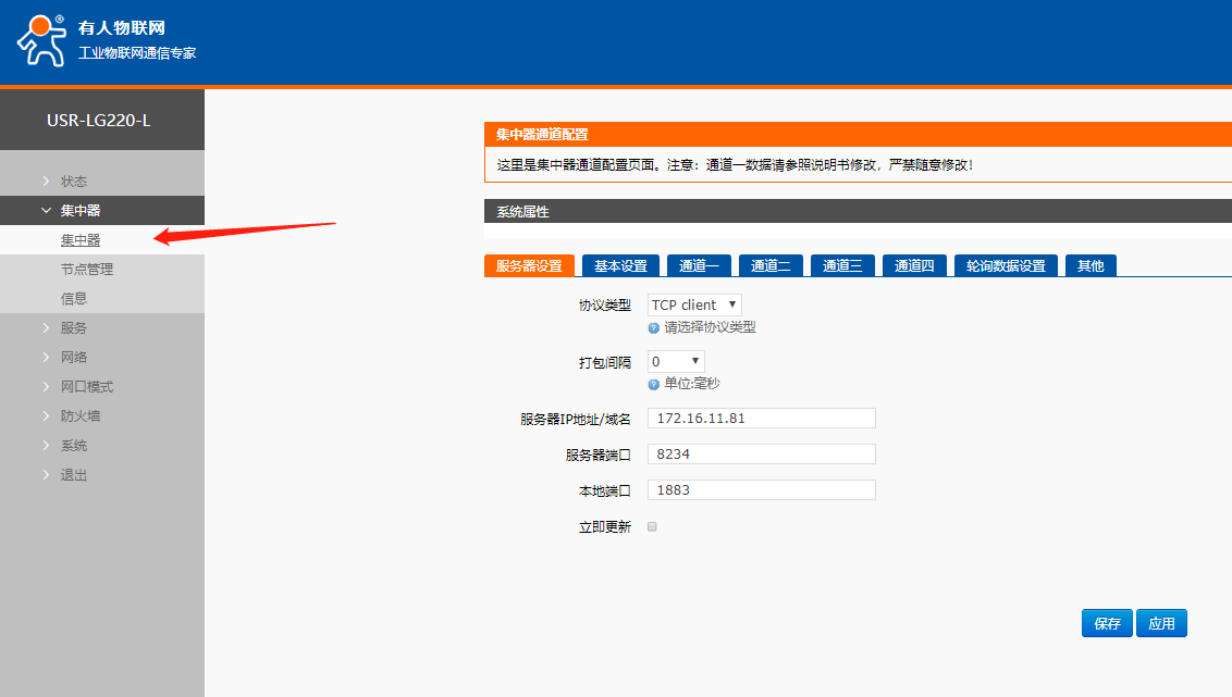 (4)設(shè)置集中器的應(yīng)用ID,依次點擊集中器,基本設(shè)置,應(yīng)用ID,設(shè)置應(yīng)用ID和lora相同。最后保存應(yīng)用。