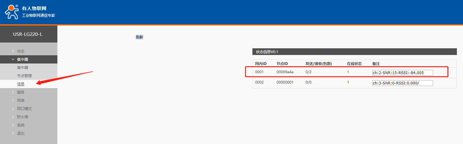 (6)點擊系統(tǒng)—重啟,執(zhí)行重啟。重啟完畢登陸集中器在集中器—信息 可參看加入的節(jié)點信息,串口助手會顯示連接對象ip與端口號。