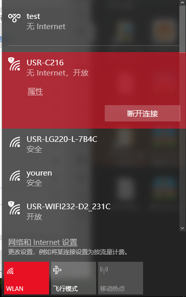 (1) 將模塊焊接到測試底板上,測試板串口連接電腦串口,電腦連接WiFi。在電腦無線搜索欄,搜索USR-C216,連接。