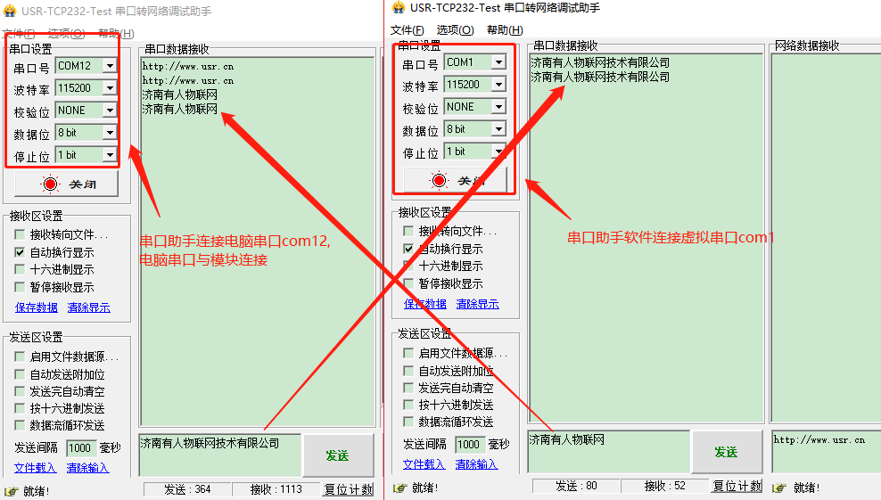 打開兩個串口調(diào)試助手軟件,一個連接電腦串口com5,一個連接虛擬串口com1.實現(xiàn)兩個串口直接數(shù)據(jù)互發(fā)。