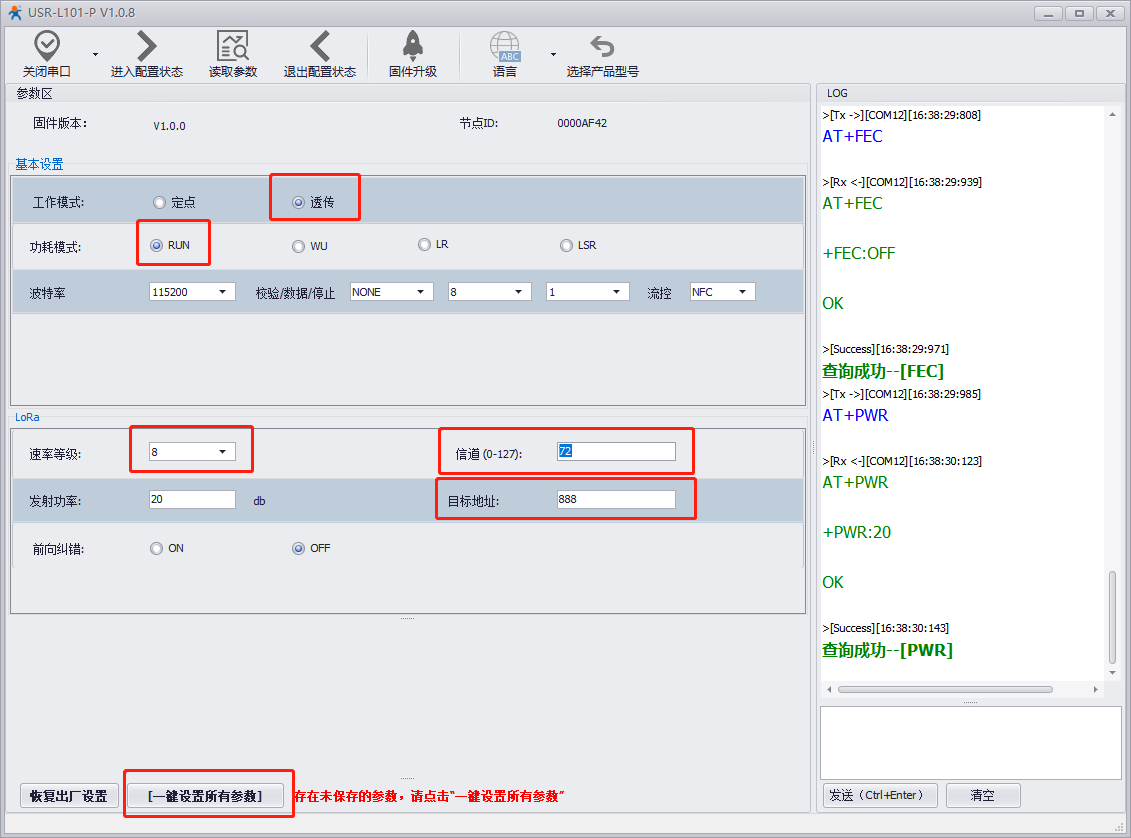 打開(kāi)LoRa設(shè)置軟件(產(chǎn)品型號(hào)選擇L101-P),依次點(diǎn)擊打開(kāi)串口(選擇A、B對(duì)應(yīng)的串口號(hào),串口參數(shù):115200,None,8,1,NFC)、進(jìn)入配置狀態(tài)、讀取參數(shù)、配置參數(shù)、一鍵設(shè)置所有參數(shù),關(guān)閉LoRa設(shè)置軟件。