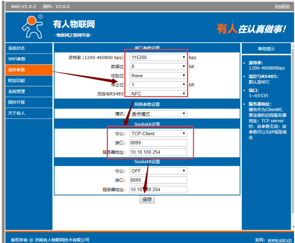 c. 進(jìn)入串口及網(wǎng)絡(luò)設(shè)置頁(yè)面 ,修改波特率等同AP模塊一致。修改完成后點(diǎn)擊 確認(rèn) 保存設(shè)置。將網(wǎng)絡(luò)參數(shù)設(shè)置中的SERVER改成CLIENT,服務(wù)器地址改為:10.10.100.254(AP設(shè)備的IP地址).