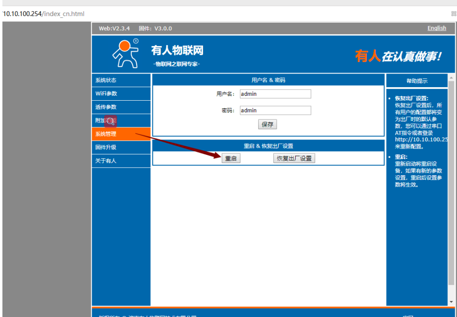 d. 進(jìn)入系統(tǒng)管理界面點(diǎn)擊 “重啟” 重啟模塊使改動(dòng)生效。此時(shí)對(duì)AP模塊的設(shè)置完成。