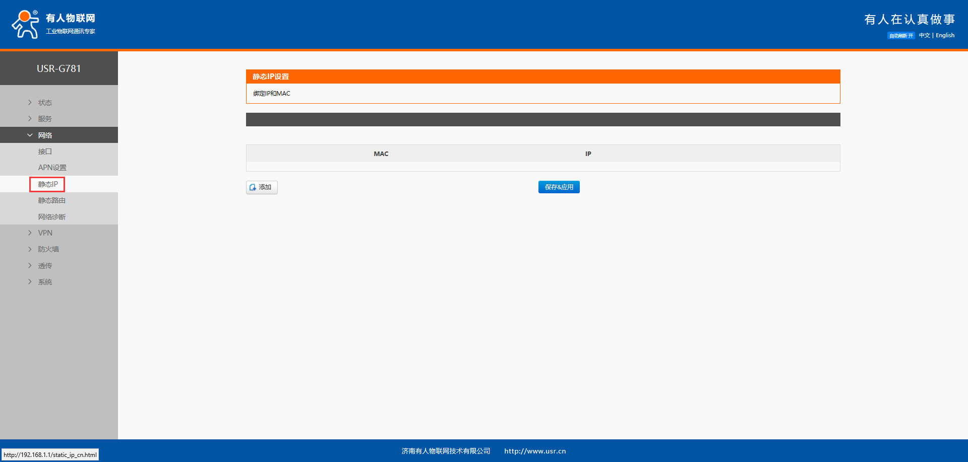 1、 進(jìn)入G781的設(shè)置網(wǎng)頁(yè),進(jìn)入網(wǎng)絡(luò)------靜態(tài)IP設(shè)置界面,如下圖所示。在該界面可以設(shè)置MAC和IP綁定,從而讓設(shè)備能夠以固定IP接入路由器: