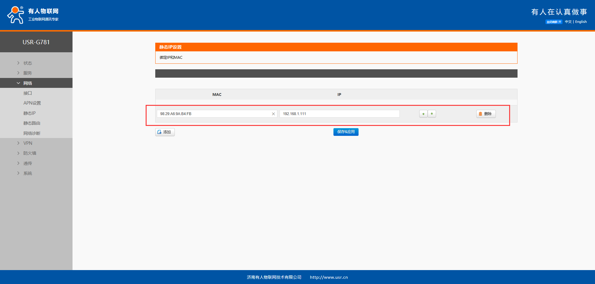 可以設(shè)置該設(shè)備綁定IP地址192.168.1.111,注意,綁定的IP地址必須和G781的LAN口IP在同一網(wǎng)段,MAC必須加:分隔。設(shè)置完后,保存應(yīng)用,然后重啟設(shè)備。