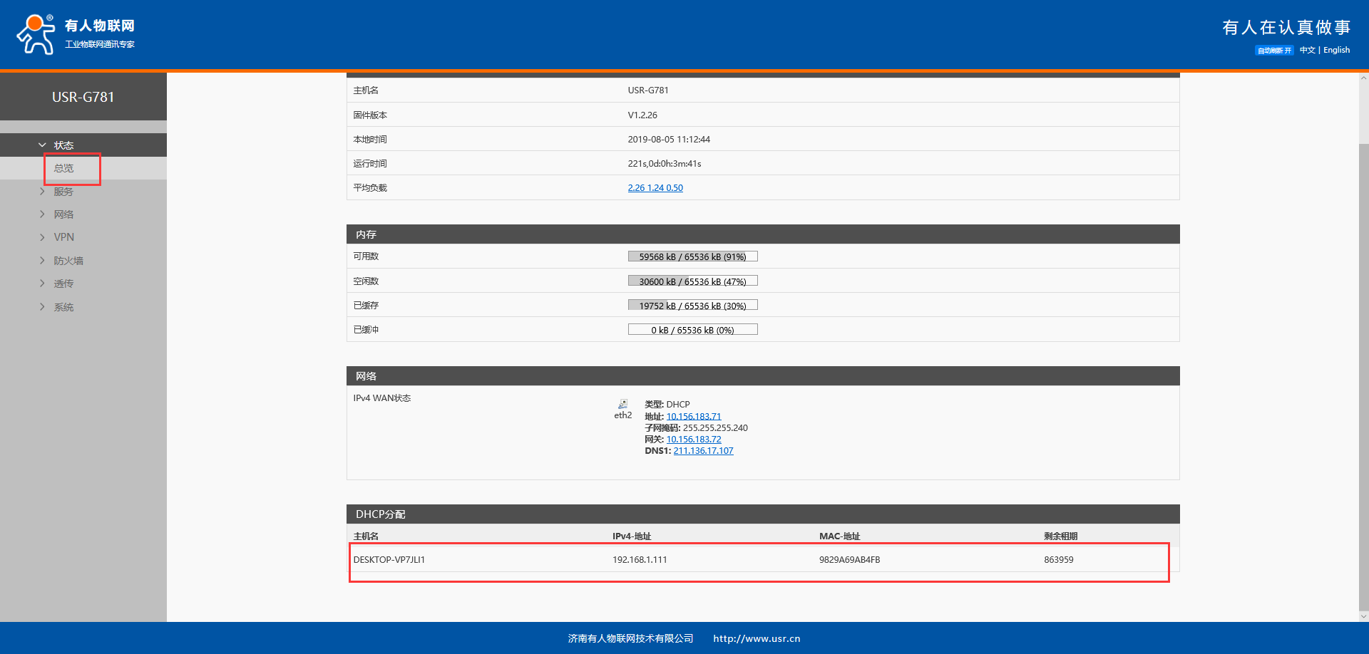 注意:若不知道設(shè)備MAC,且之前設(shè)備是DHCP接入G781,可以在狀態(tài)總覽界面的DHCP分配看到設(shè)備的接入信息。