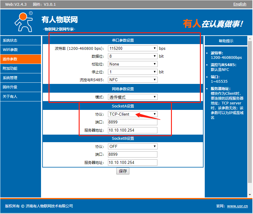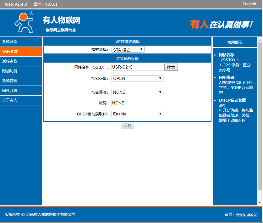 c. 將wifi模式選擇改為 STA模式, 可以填寫或搜索您要連接的AP名稱、密碼等參數(shù)。如果需要給模塊設置固定IP,請在下面的“DHCP自動獲取IP”選項改為“Disable”,設置完成后需要點擊保存應用。