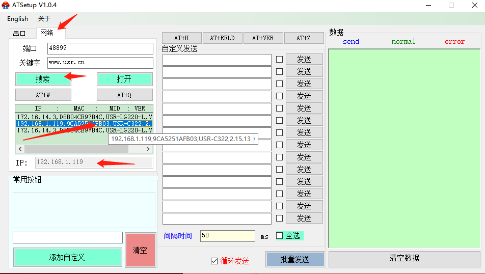 5) 也可在此界面發(fā)送AT指令進(jìn)行查詢或配置,發(fā)指令無返回時(shí),需要重新點(diǎn)擊“搜索”。