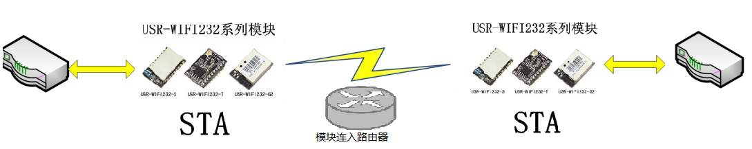 這一應(yīng)用中,兩個(gè)USR-WIFI232模塊通過無線路由器組網(wǎng)WIF I無線點(diǎn)對點(diǎn)連接,如圖所示,這樣的組網(wǎng)方式為用戶設(shè)備搭建了一個(gè)透明串口通路。