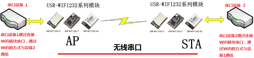 這一應(yīng)用中,兩個(gè)USR-WIFI23模塊組網(wǎng)WIF I無線點(diǎn)對點(diǎn)連接,如圖所示,這樣的組網(wǎng)方式為用戶設(shè)備搭建了一個(gè)透明串口通路。