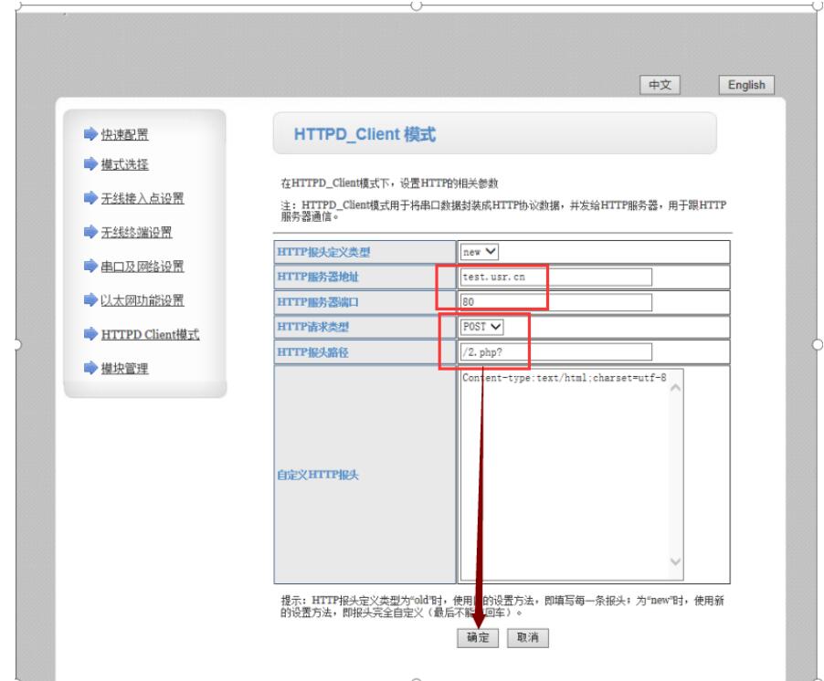 2、在模式選擇設(shè)置為STA模式,數(shù)據(jù)傳輸格式為Httpd client ,設(shè)置完點(diǎn)擊確定;