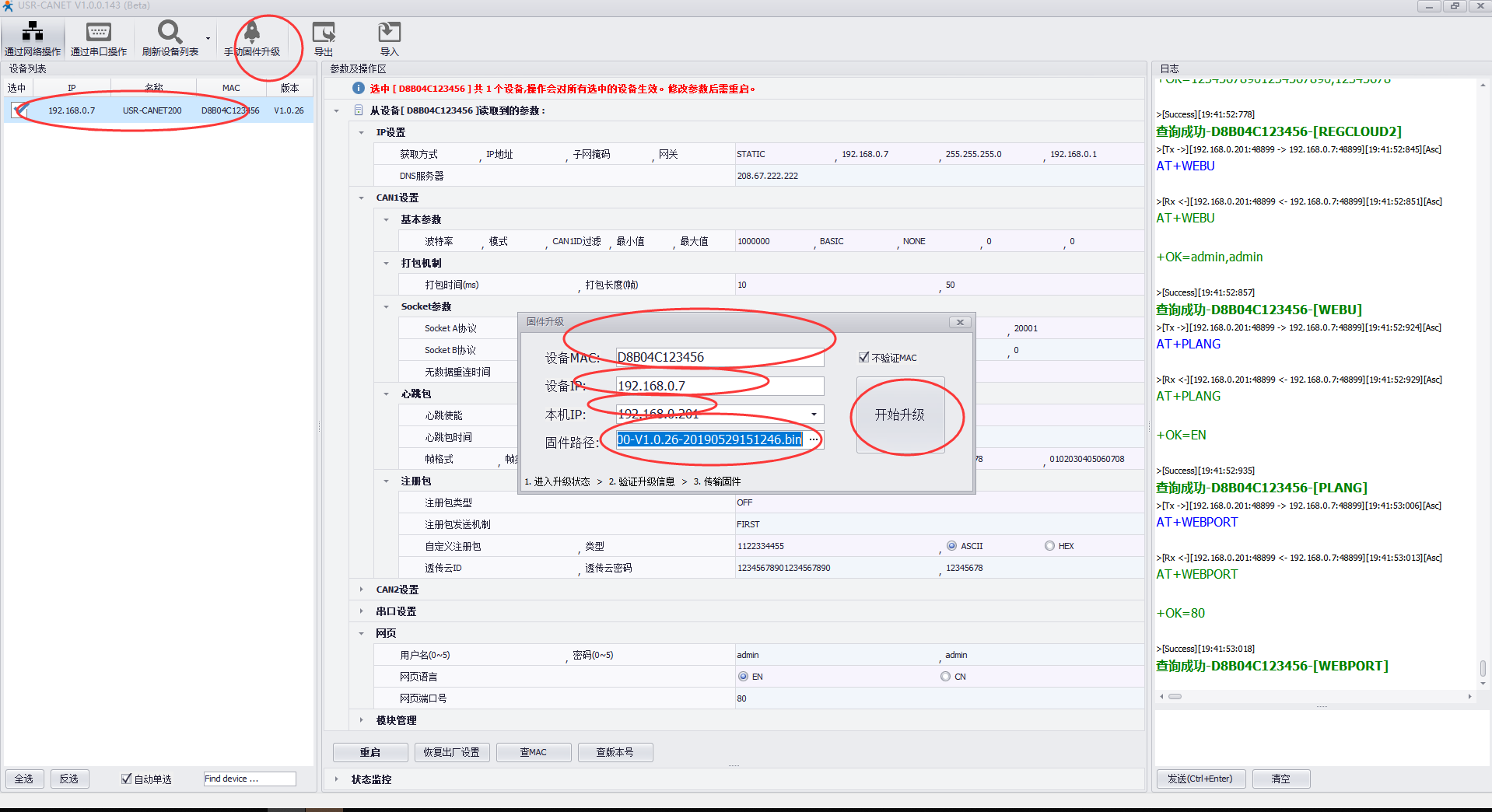 USR-CANET200、標(biāo)準(zhǔn)電源適配器、所要升級(jí)的固件(可提工單獲取最新固件)、USR-CANET V1.0.0.143 (Beta)(設(shè)置軟件,用來(lái)固件升級(jí)的工具)。