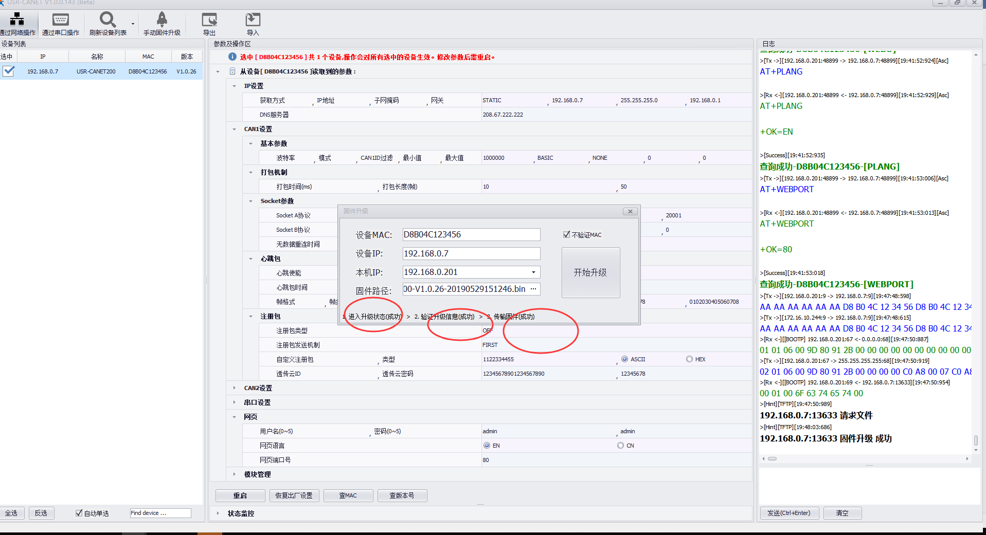 進(jìn)入升級(jí)狀態(tài)(成功)-驗(yàn)證升級(jí)信息(成功)-傳輸固件(成功)