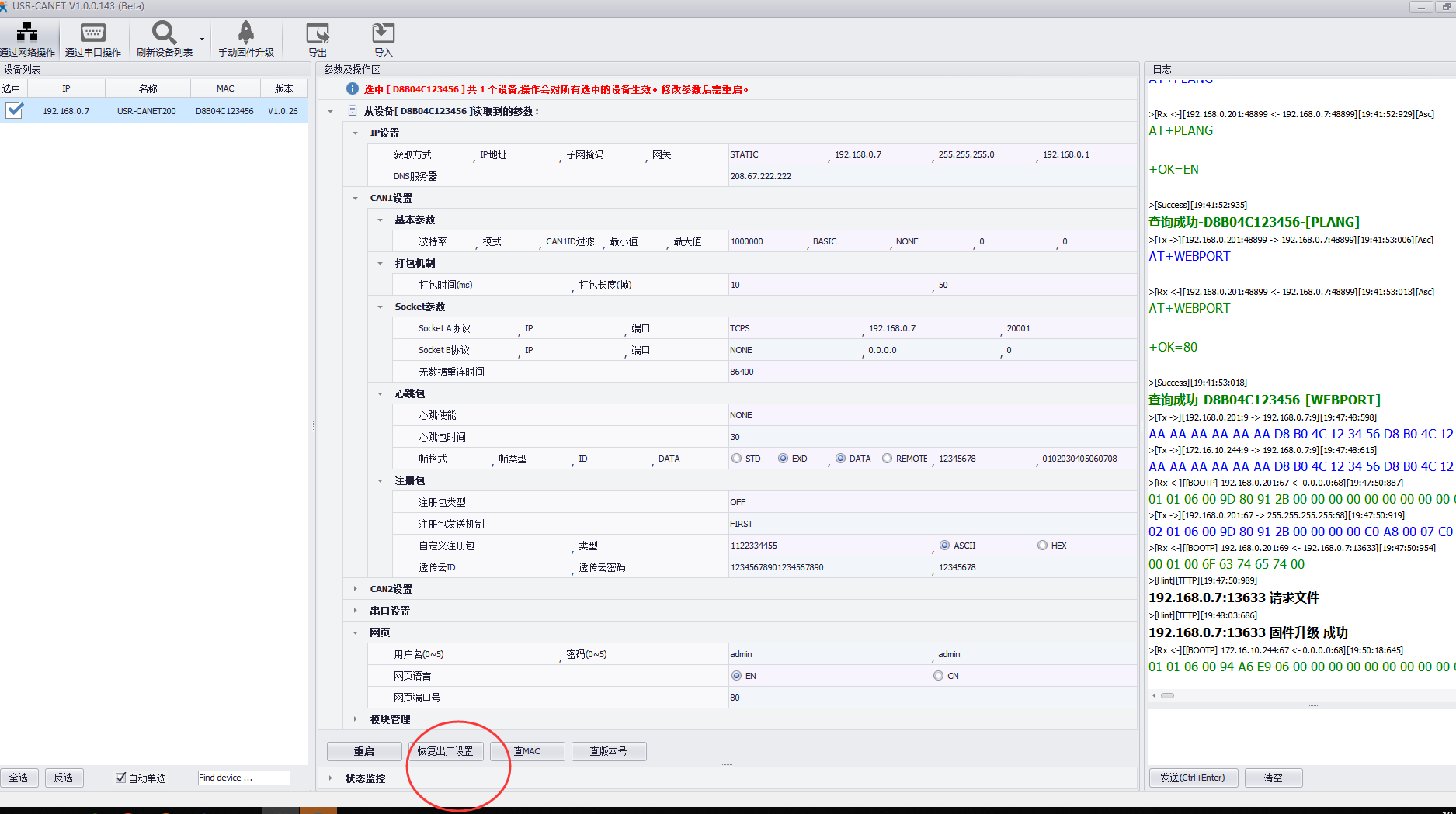 2.打開設(shè)置軟件:USR-CANET V1.0.0.143 (Beta),點(diǎn)擊通過(guò)“網(wǎng)絡(luò)操作”,然后點(diǎn)擊“刷新設(shè)備列表”,搜索到設(shè)備之后,勾選到相關(guān)的設(shè)備。設(shè)備的參數(shù)會(huì)刷新。